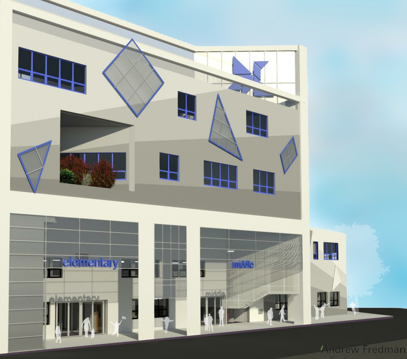 The challenge in this project was multi-faceted. Faced with 3 existing abutting buildings, all built at different times with differing floor heights, and outfitted as civil offices, we needed to develop a program and design to house a growing educational community. The project needed to be built in phases so students could attend school in the retrofitted existing structures while an addition over the top of the current structures was built. The uniqueness of the New York City zoning lot (it contains all three lot types- corner, through and interior) and the desires of the school helped to inform the design of the project.